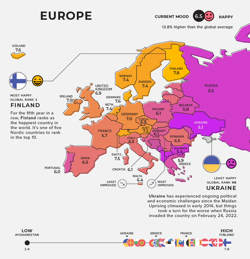 Romania was the most improved country in Europe, climbing 18 spots on the global ranking since last year’s report. Over the last decade, the country has seen some of the most significant economic growth in the European Union and was able to bounce back quickly from its COVID-19- triggered slump. Ukraine ranks in last place, making it the unhappiest country in Europe. Ukraine has experienced ongoing challenges since the Maidan Uprising peaked in 2014. Events in the country have recently taken a turn for the worse, when Russia launched a full-scale invasion of Ukraine on February 24, 2022. As a result of the conflict, over 3 million people have fled the country.