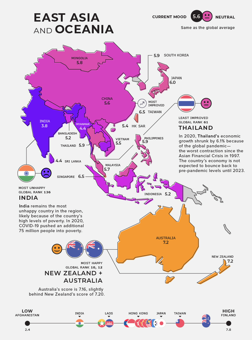 Worldwide happiness comes in at an average score of 5.6, which is a slight improvement since last year’s report. Below, we dive into each region’s happiness levels.