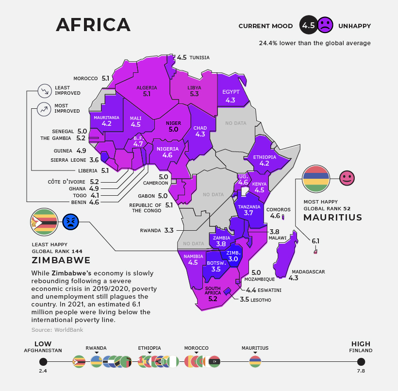 With a regional score of 4.5, Africa ranks as the unhappiest region worldwide. Zimbabwe remains the most unhappy country in the region, as it continues to struggle with high levels of poverty. In 2021, approximately 6.1 million people were living below the international poverty line.