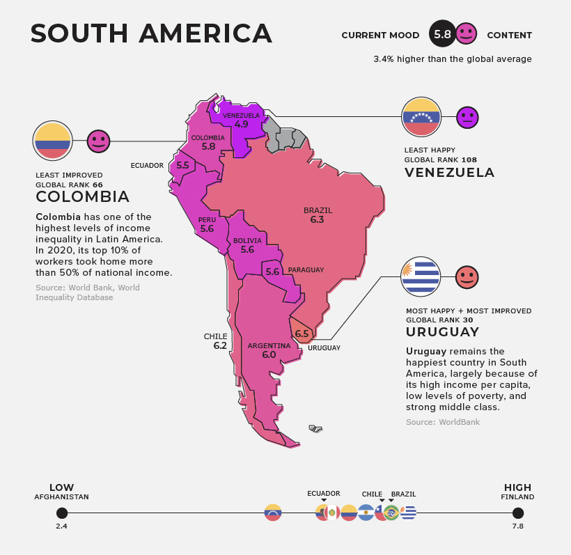 Uruguay retains its top spot as the happiest country in South America. It continues to rank high on the list because of its high income per capita, relatively low levels of poverty, and strong middle class. While Uruguay was not immune to the impacts of COVID-19, the country was able to transition smoothly to online learning and was the first country in the region to reopen schools.