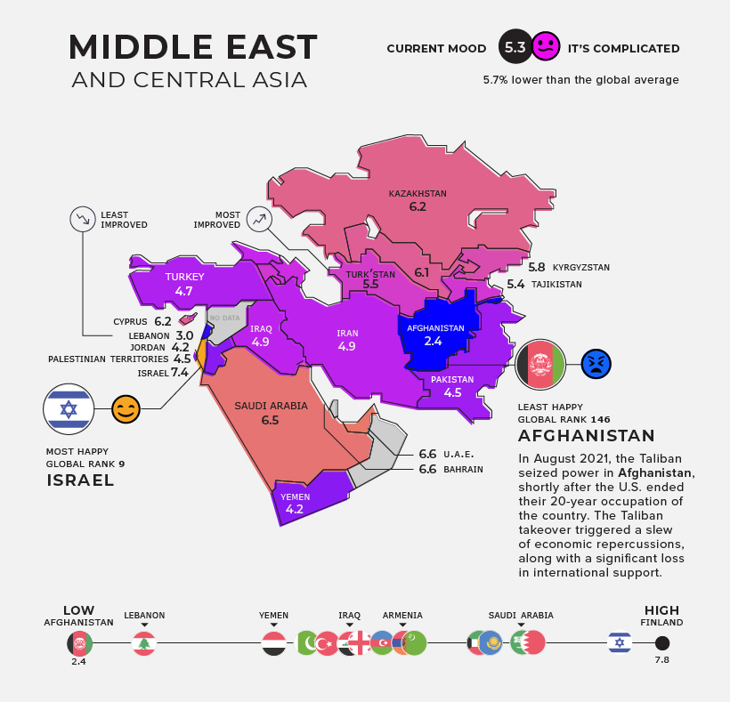 This map pulls data from the World Happiness Report to uncover the average happiness scores of 146 countries. It shows average scores from 2019 to 2021, and highlights which countries are the happiest—or unhappiest—and why.